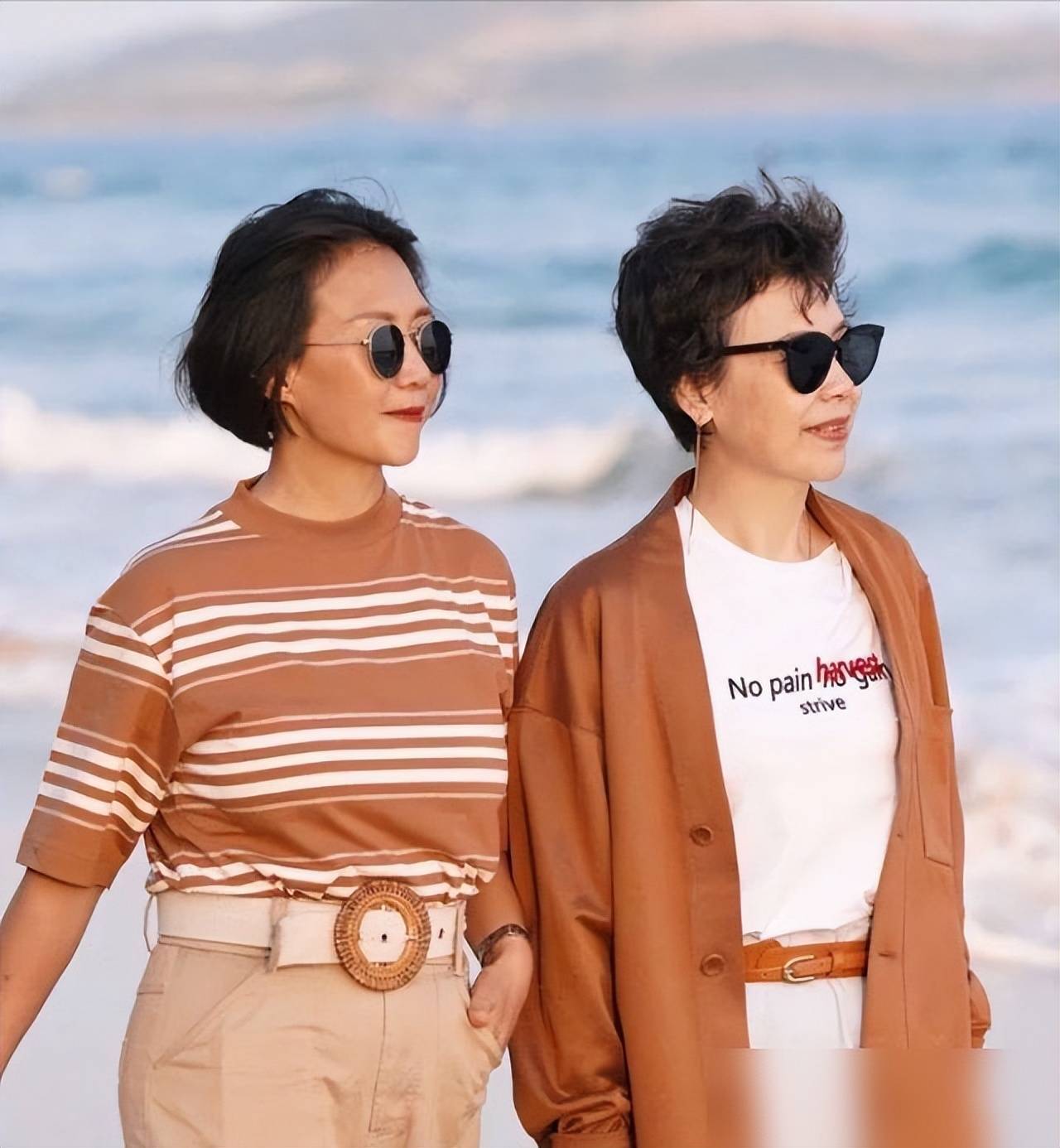 齐肩短发真的是“万能款”——陈数那种碎碎的齐肩发,披下来时,碎发刚好遮住太阳穴的凹陷,扎起来时,发尾翘一点,像“少女扎发”;波波头更绝,袁泉的波波头,发尾内扣,把她眼部凹陷的缺点盖住,整个人温柔得像“岁月静好的姐姐”。我同事剪了波波头,说“以前长发要吹十分钟,现在三分钟搞定,还显脸小”——你看,中年女人的短发,赢在“省时间”和“显精神”。
